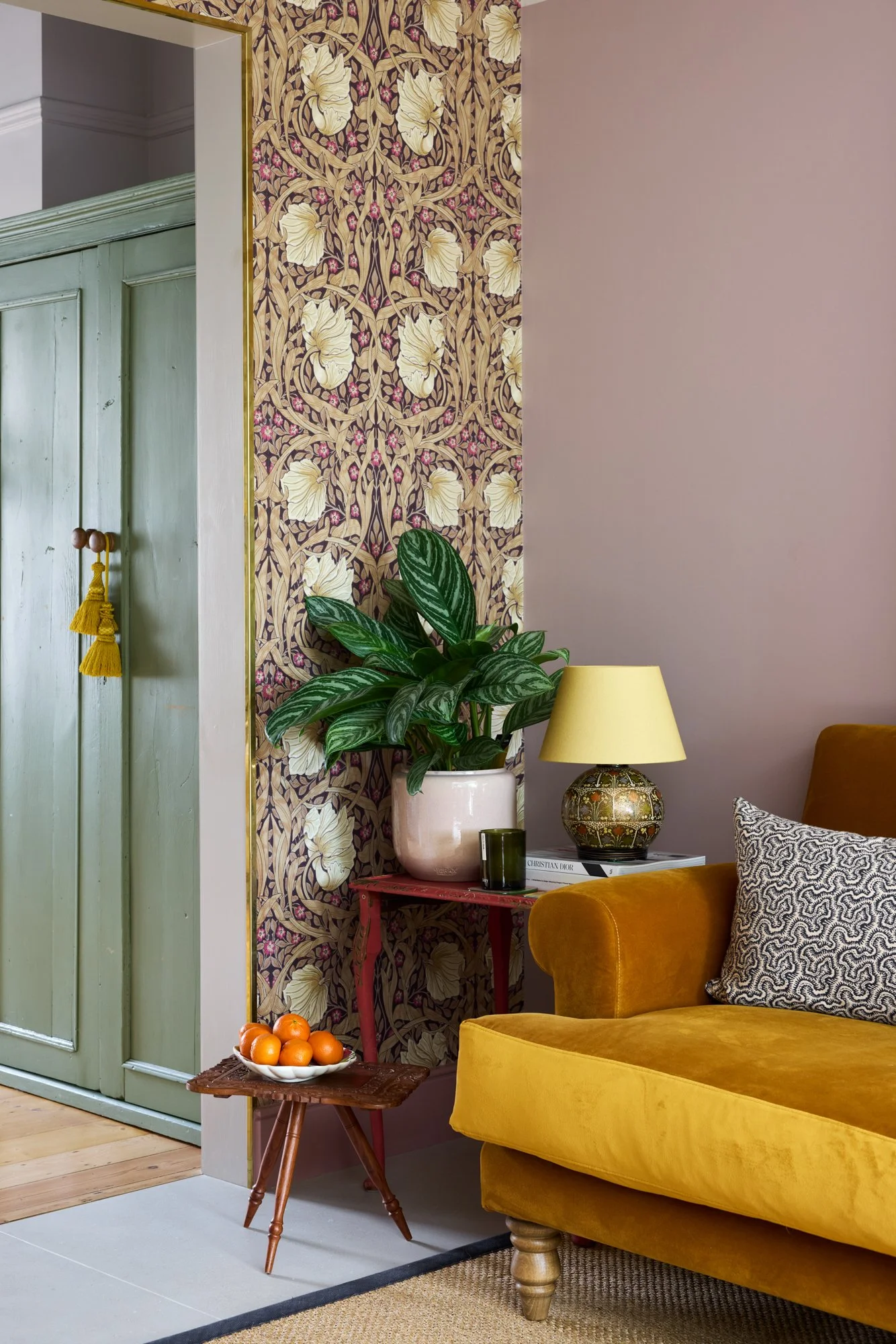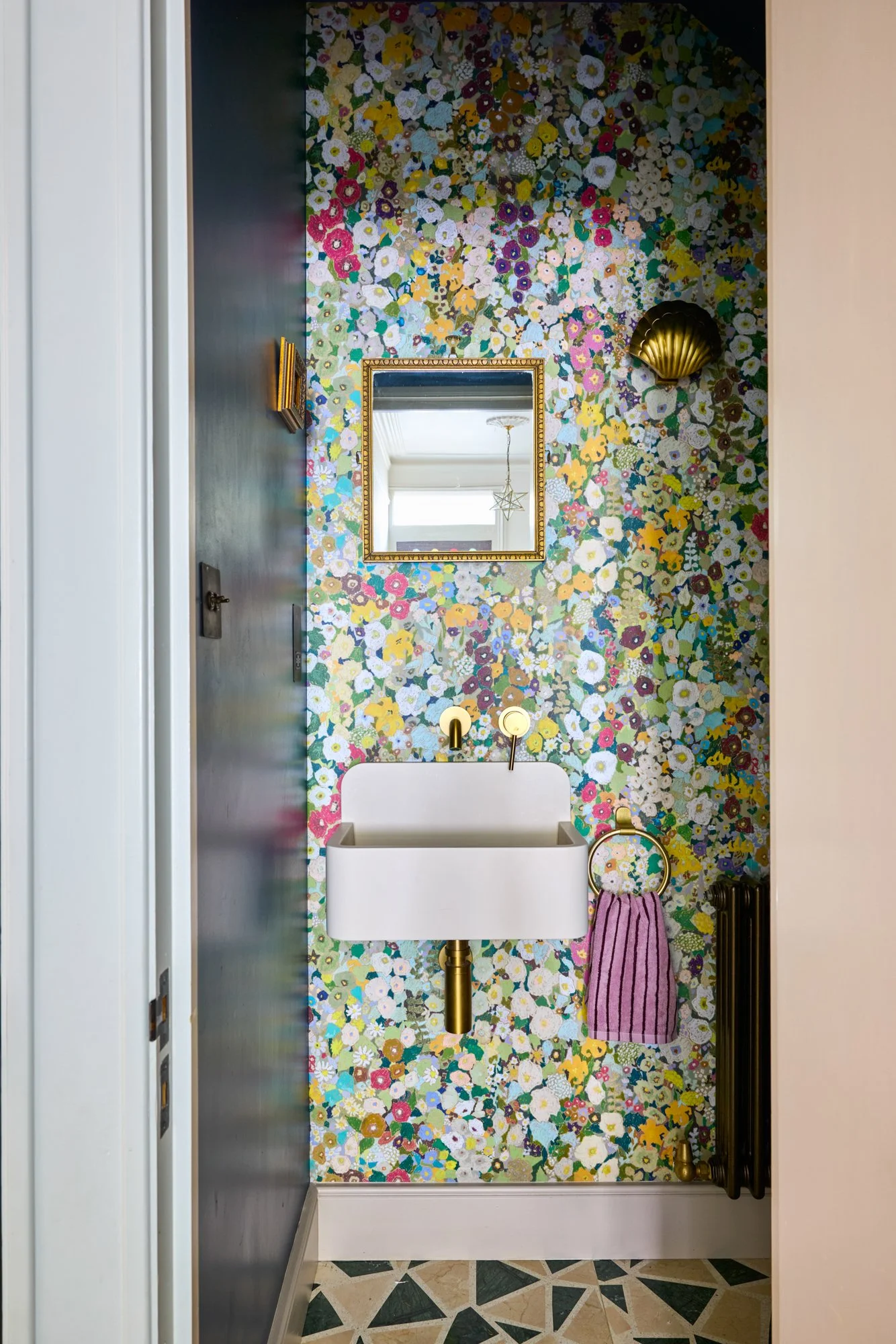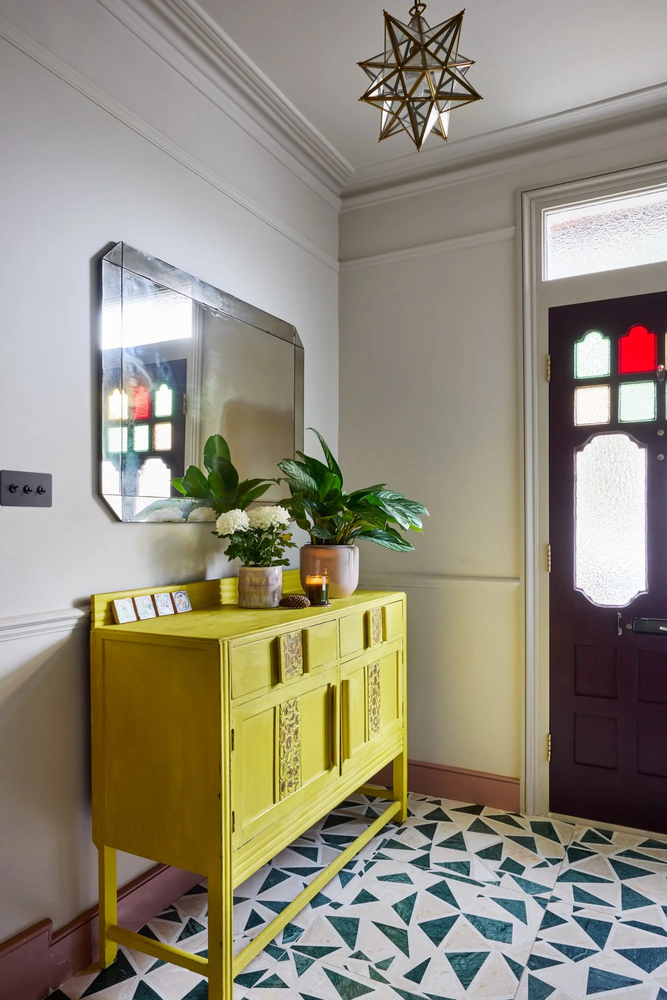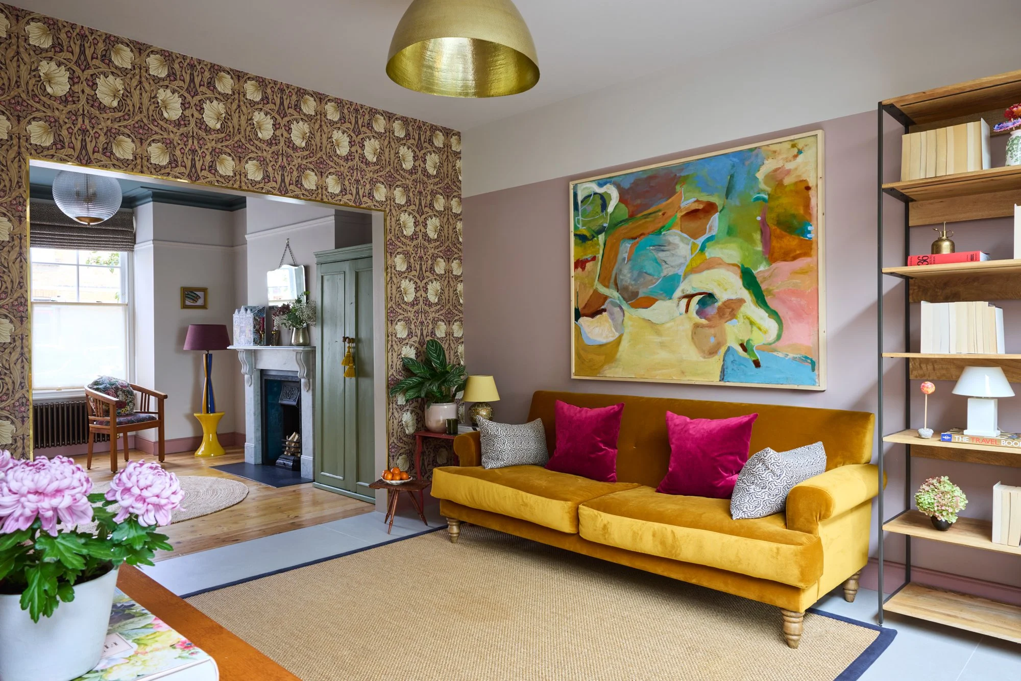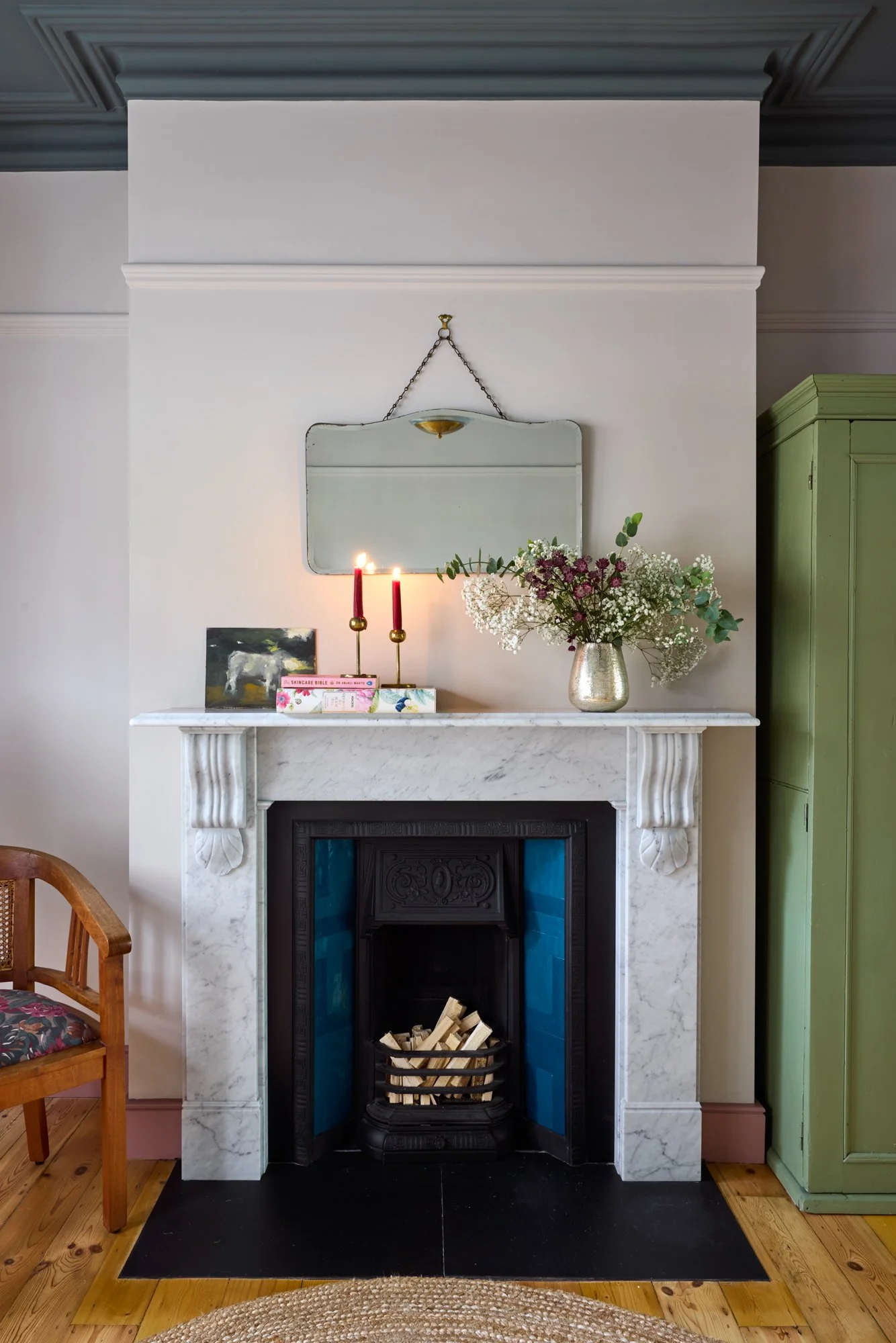 No surface here is plain white; even the lightest walls carry soft warmth — plaster pinks, greens and earthy neutrals. Zellige and terrazzo tiles meet marble, brass and timber. Reclaimed fireplaces and second-hand furniture sit alongside bespoke pieces, creating a healthy balance between what’s new, renewed and rediscovered. Despite its richness, the house feels uncluttered — a reflection of Sarah’s patient, conscious way of bringing only what truly belongs.